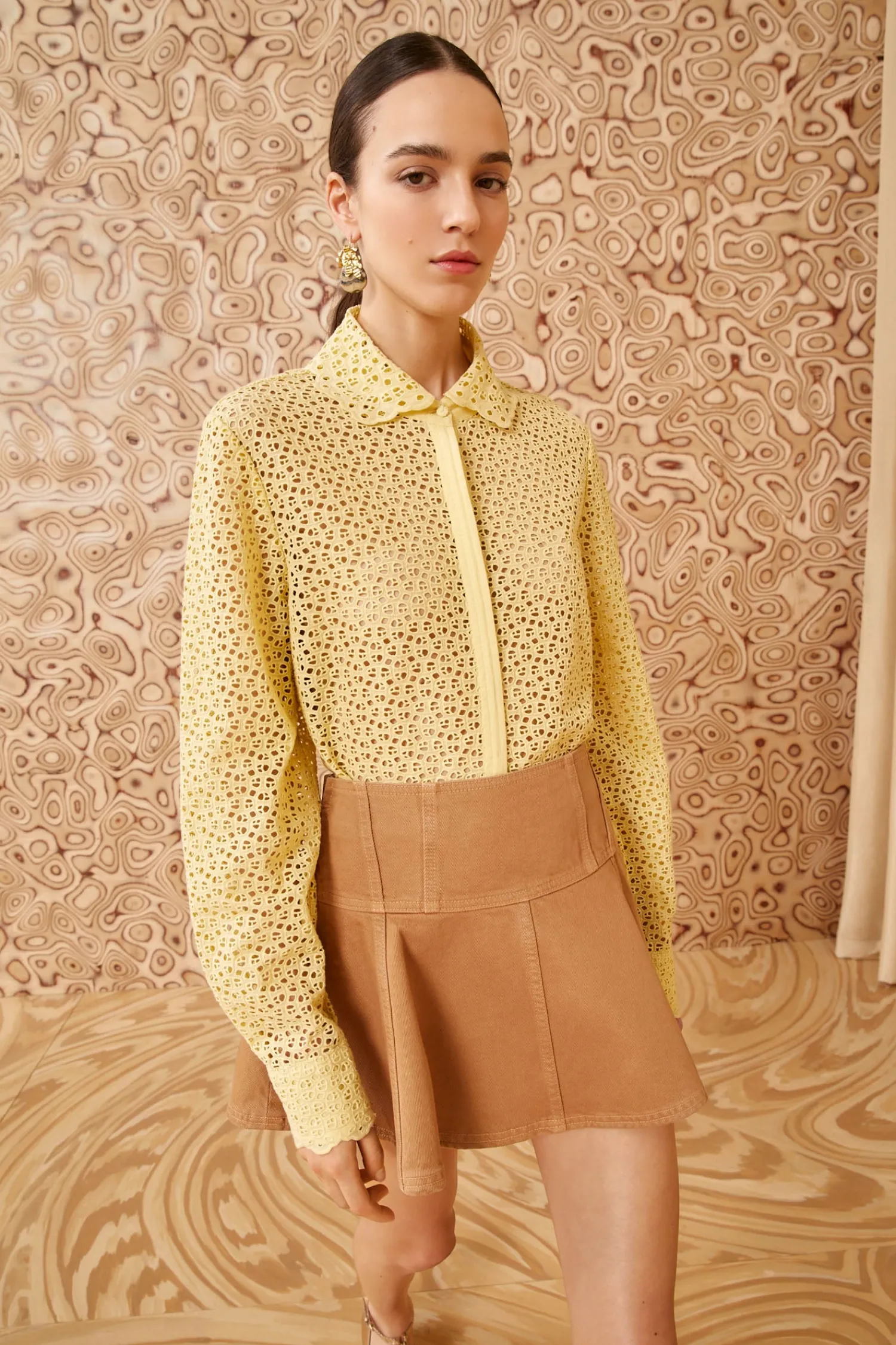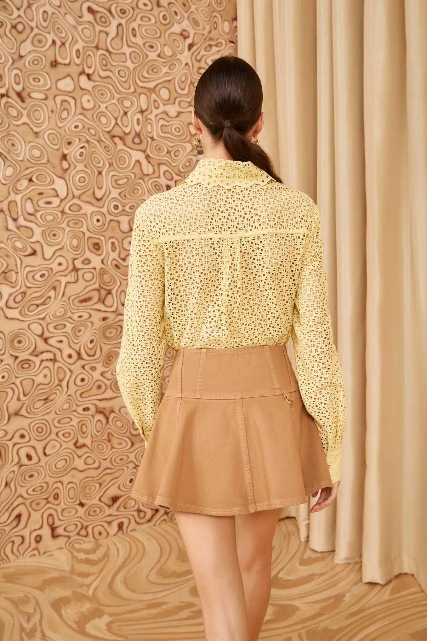 Featured in Look 37 of our Pre-Fall 2024 Lookbook, our Vera Skirt marks the first mini silhouette to join our premium denim lineup. Handcrafted in Los Angeles in our khaki-hued Tangier wash, this fun and flirty style has a yoke seam and flares out at the hem for volume. Coordinate with our Alessa Jacket for the complete look.