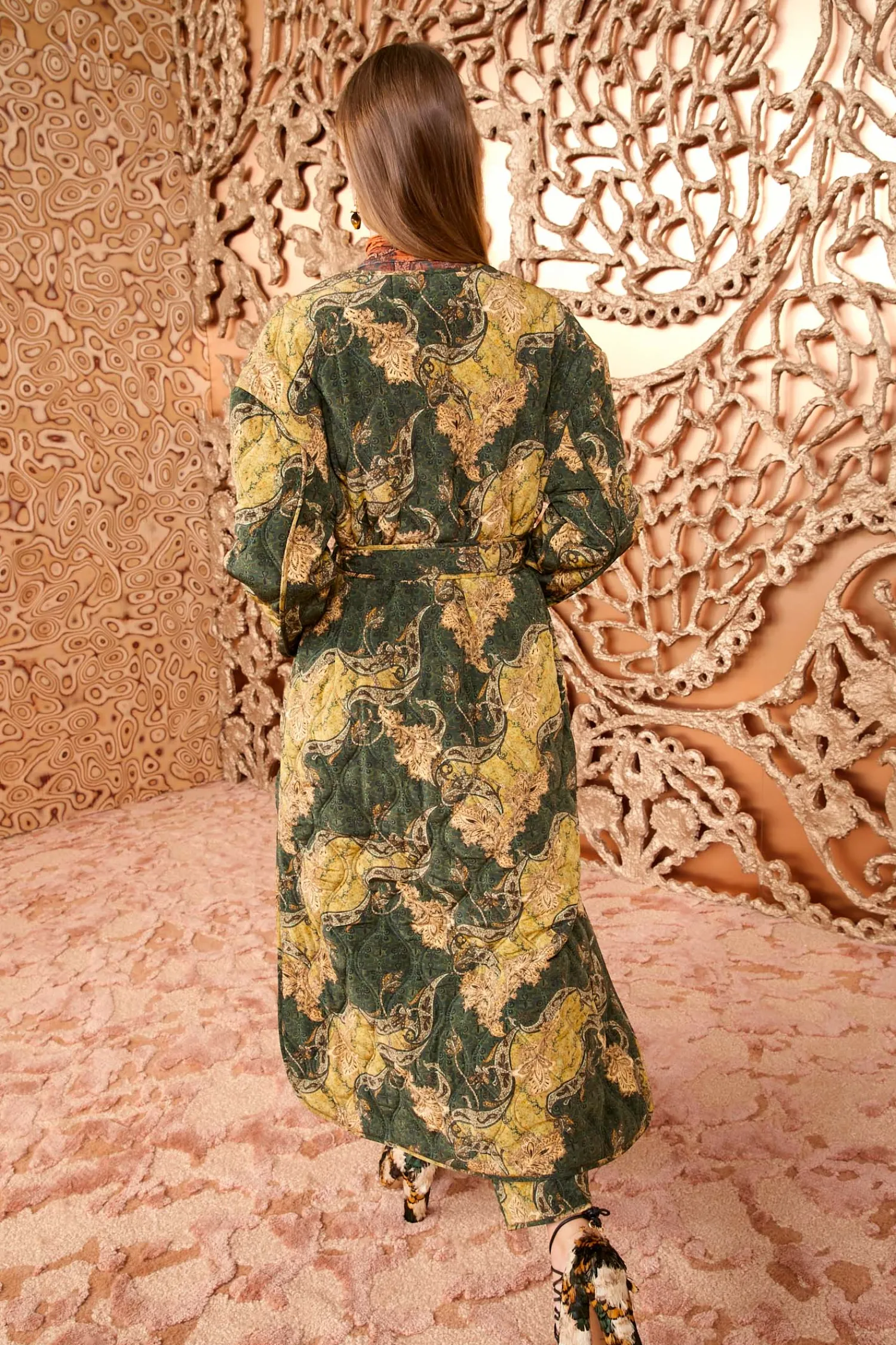 Debuting in Look 34 of our Autumn/Winter 2024 runway show, the Theo Coat is an elegantly oversized silhouette cut from quilted silk crepe de chine, printed in a chimerical blend of swirled and layered paisley that brings together a mélange of patterns. Alive with deep green and yellow hues, this cocooning silhouette features a collarless neckline, cozy oversized pockets, and a matching removable belt. It fastens with buttons through the front.