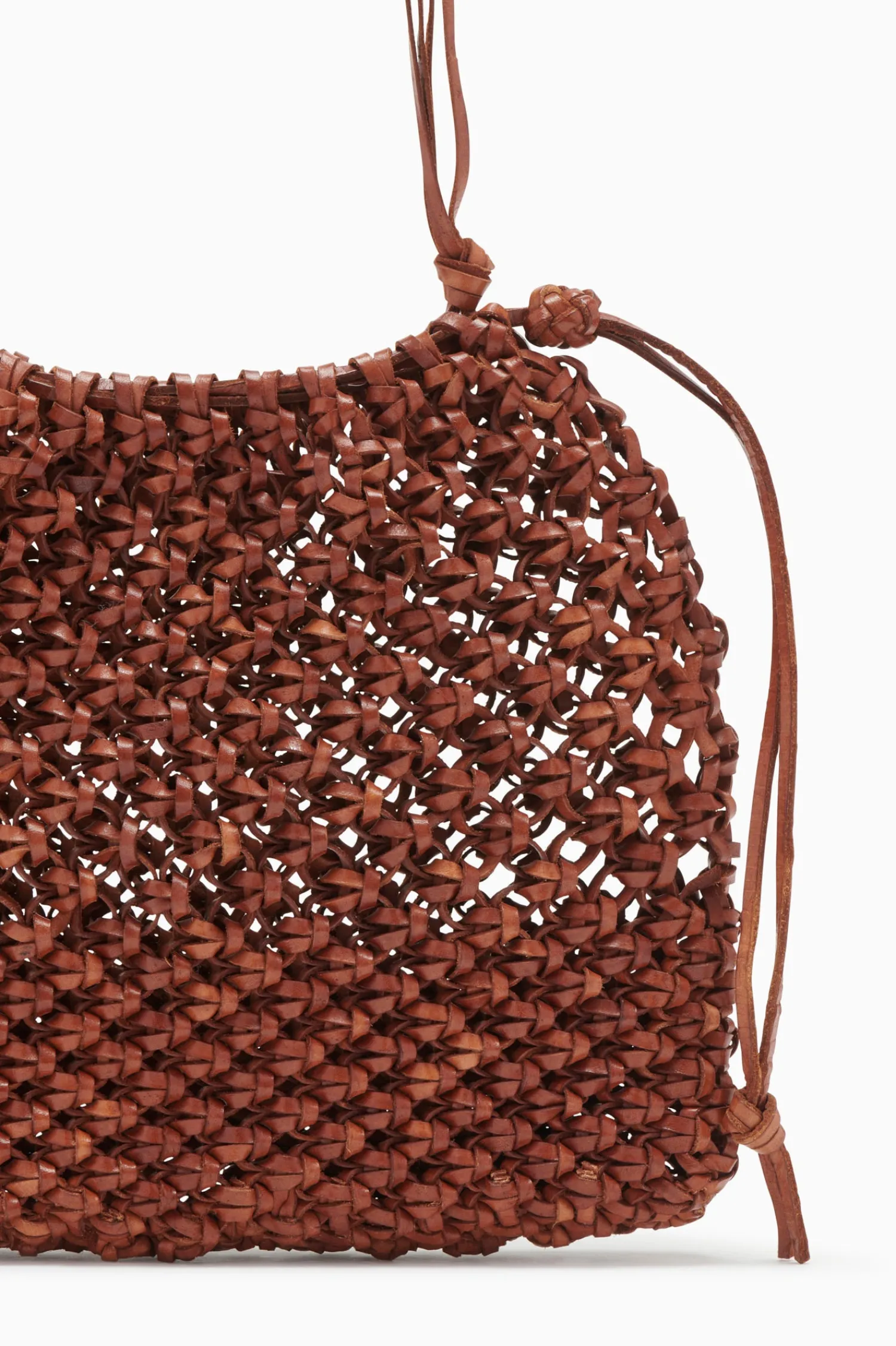 A gorgeous addition to our artisan-made handbags, our Tulia Crossbody is expertly hand-woven in India using an intricate macramé technique. Arriving in rich pecan brown, it has an elegantly slouched silhouette that fits your phone, a drawstring top, and an adjustable shoulder strap with knotted detailing. Due to the handmade beauty of this piece, no two are exactly alike.