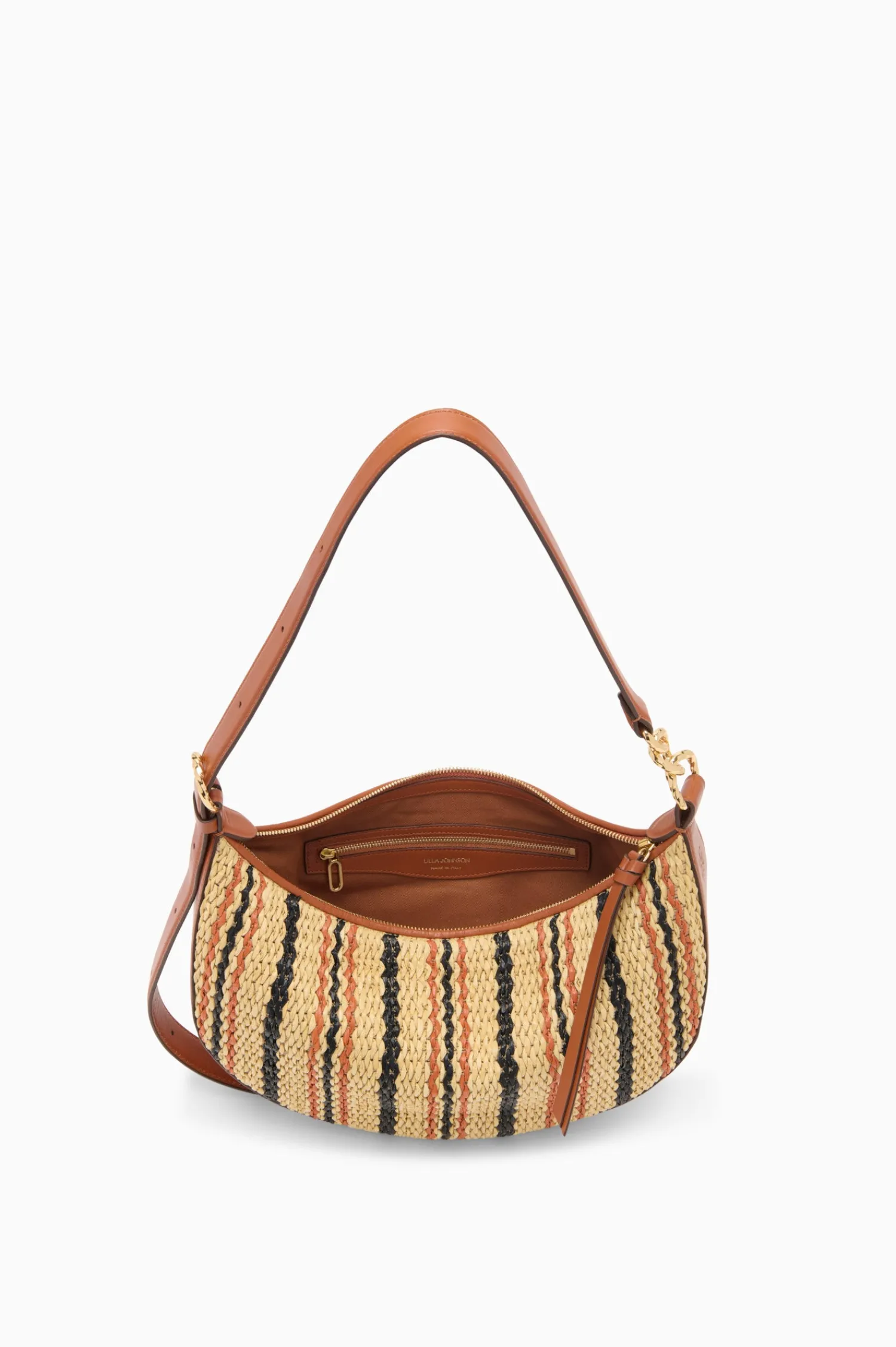 Spotlighted on our Spring/Summer 2025 runway, our iconic Twyla Hobo is updated in a graphic raffia textile for a touch of novelty. Sculpted in Italy, it features a small slouchy, crescent shape that can be worn over the shoulder or as an elegant crossbody. It is trimmed with soft leather and is finished with our new signature twisted hardware in lustrous antique brass.
