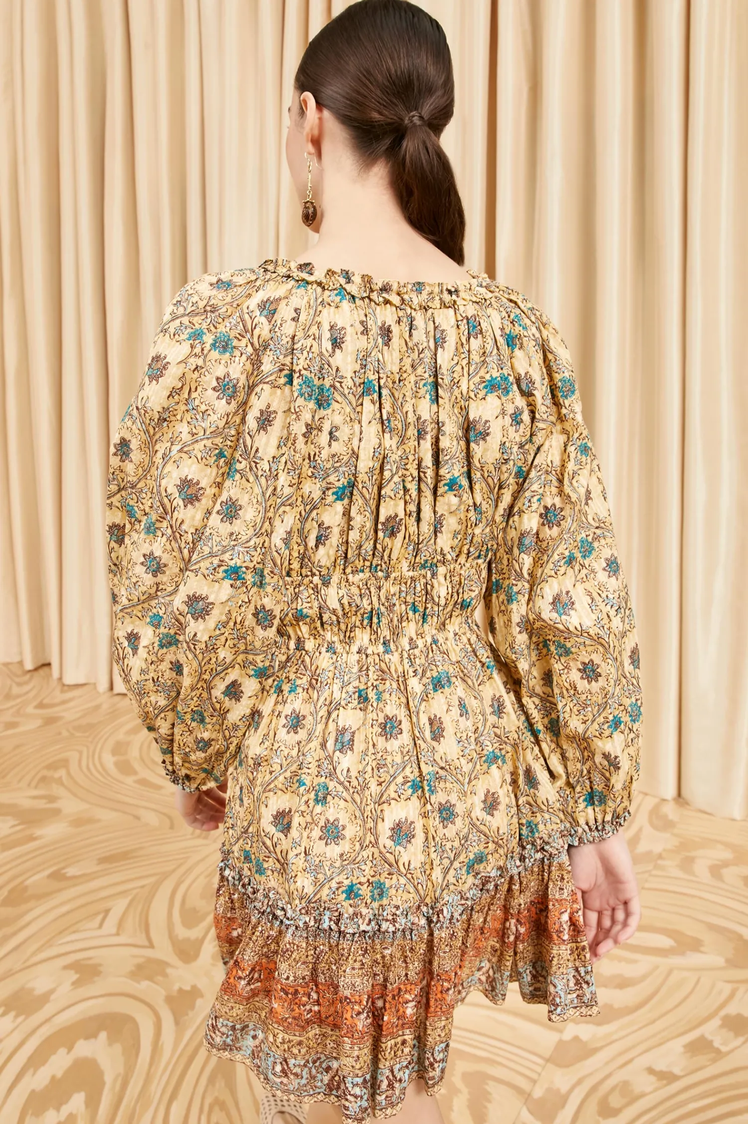 Crafted from airy shadow stripe cotton, our Val Dress arrives softly adorned with botanicals inspired by a 19th century Persian pint—the earthen yellow and green hues mimic the natural dyes used in the original pattern. This breezy frock has voluminous long sleeves with elastic cuffs, and elastic waist, and delicate ruffles at the neckline and skirt. The delicate neckties create a keyhole front.
