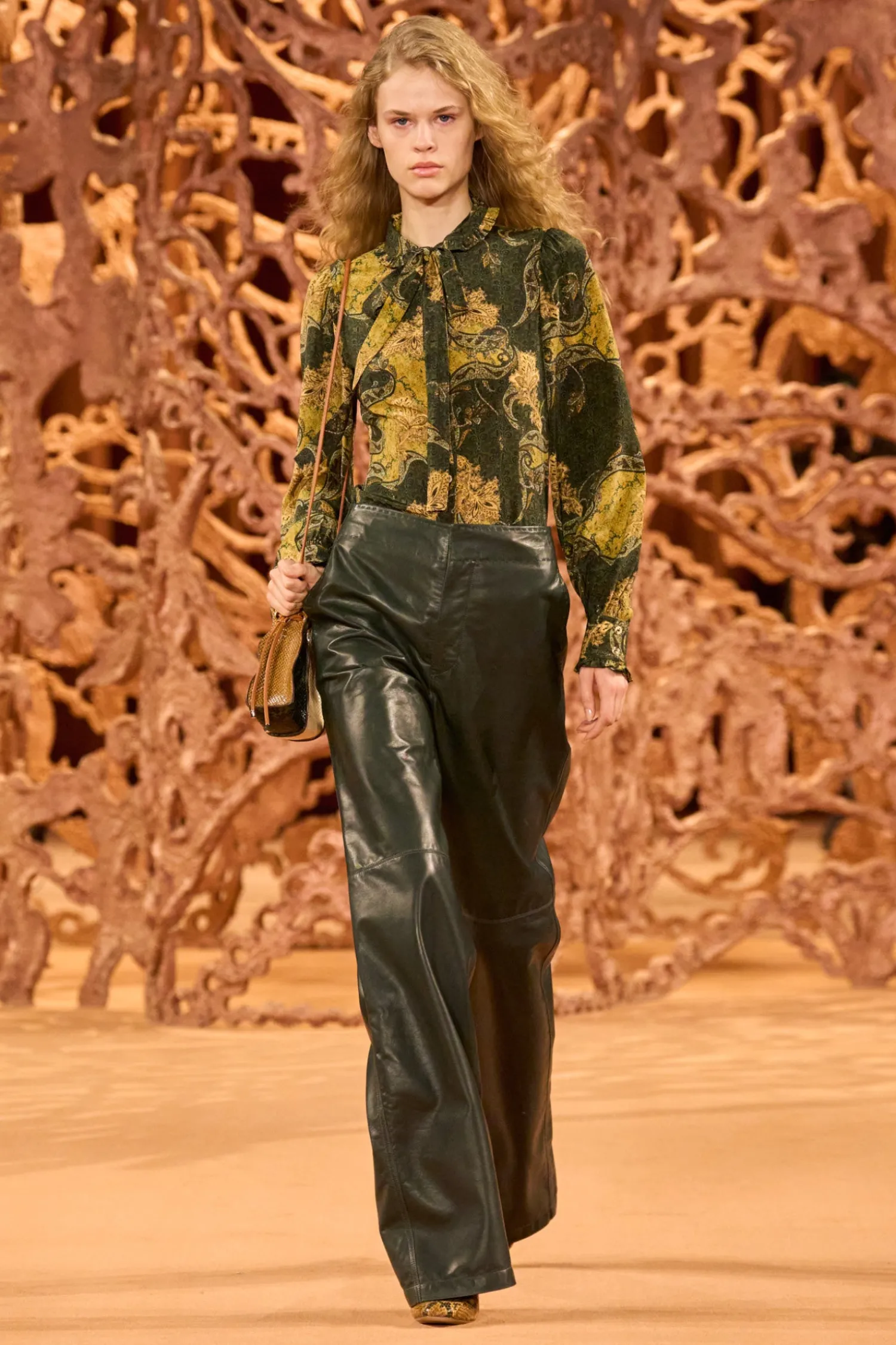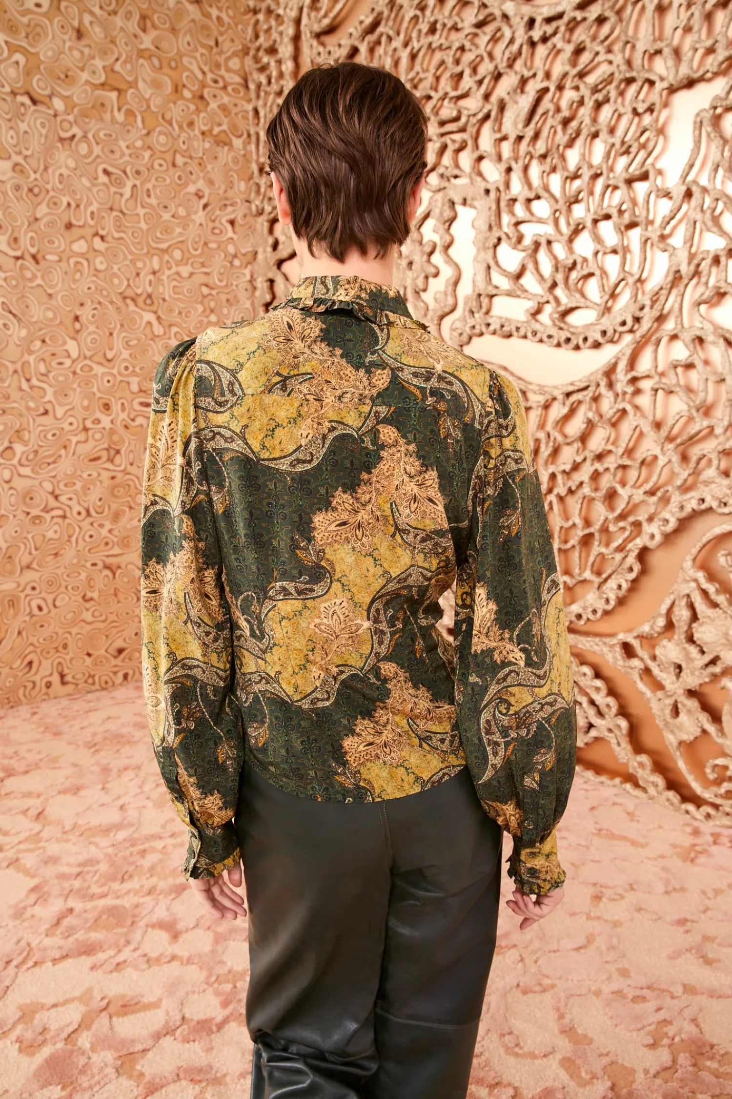 Featured in Look 28 of our Autumn/Winter 2024 runway show, the Vedra Blouse is a gorgeous silhouette cut from silk crepe de chine, printed in a chimerical blend of swirled and layered paisley that brings together a mélange of patterns. This romantic top comes alive with yellow and green hues and boasts a slightly ruffled collar, tapered sleeves, and a lovely bow at the neckline. It fastens with buttons through the front.