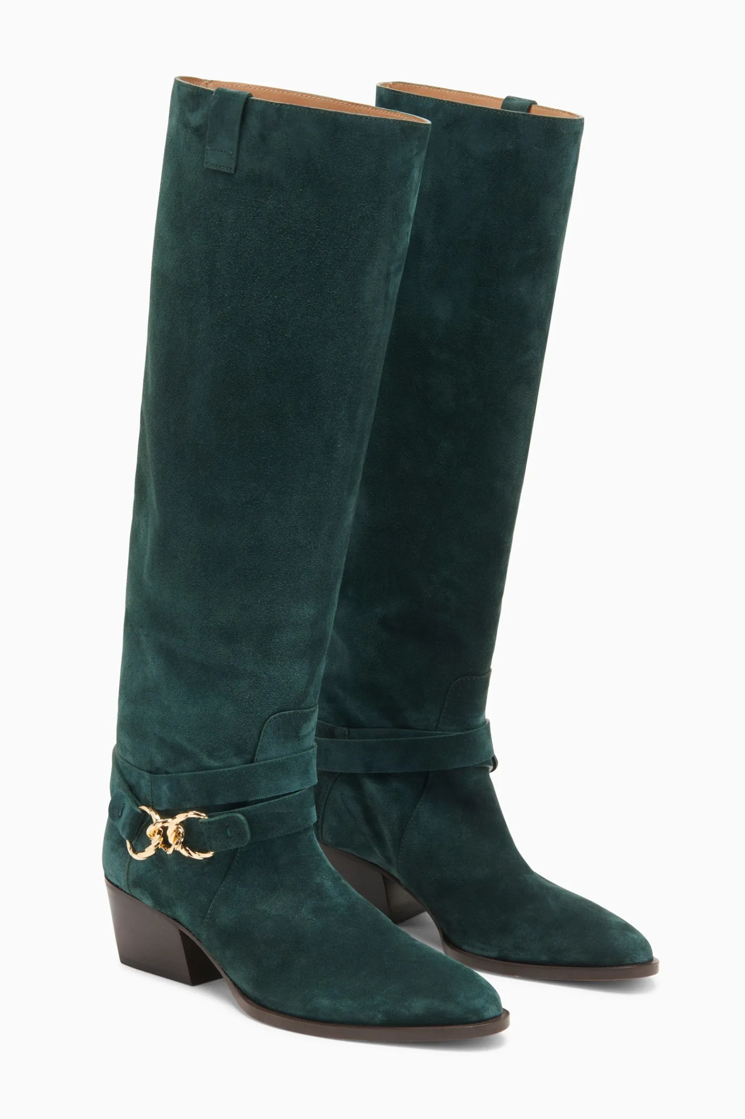 Featured in Look 46 of the Autumn/Winter 2024 runway show, our velvety suede Willow Boot returns in an irresistible shade of malachite green, accented with our new twisted antique brass hardware that’s also on our seasonal handbags for an effortless match. These knee-high beauties have a pointed toe and sit on a 50mm stacked heel.